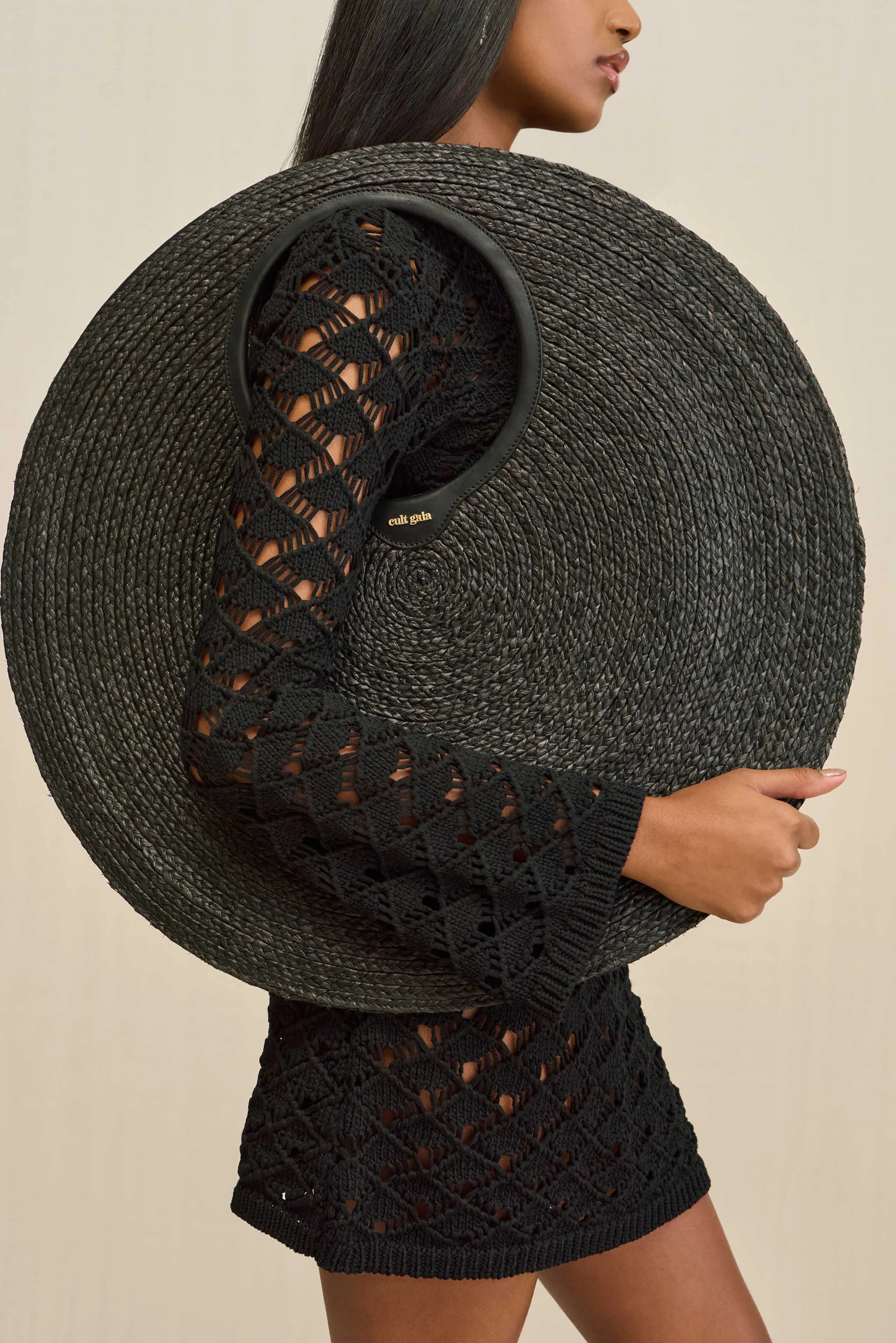 An oversized circular shoulder bag crafted out of raffia with a leather arm hole. — Shoulder bag — Black raffia — Leather arm hole — Oversized silhouette SIZE & FIT NOTES 23.50" H x 23.30" L COMPOSITION AND CARE 100% NATURAL BRAIDED RAFFIA, 100% COW LEATHER, 100% COTTON