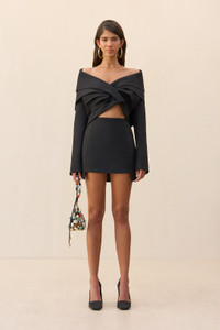 A wool mini skirt with a subtle hi-lo front cutout hem detail. — Mini length — Hi lo hem — Wool blend — Wear with the Sadia Jacket for a matching set SIZE & FIT NOTES Model is 5'10" and is wearing a size 4 COMPOSITION AND CARE 75% WOOL 25% NYLON
