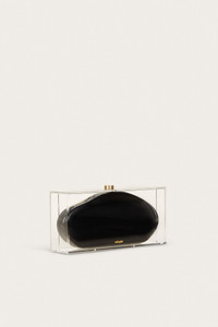 Taking a nod from 60’s mod glamour, the Annika Clutch is designed as a black curved clutch inside of a translucent box. The clear acrylic outside offers a very retro-inspired feel, and the black abstract-shaped middle casing creates a stark contrast. From weekend travels, to parties and galas — she’s sure to be an artful addition to any outing. SIZE & FIT NOTES Clear acrylic casing Snap closure at top Lined inside Can fit a large phone COMPOSITION AND CARE Body: 100% Acrylic Lining: 90% Polyester, 10% Polyurethane
