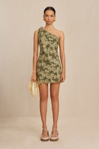 Fil-coupe textured mini-dress with an exaggerated self-tie strap at the right shoulder. — Self-tie shoulder strap — Bias-cut — Lined — Slip on wear FIT NOTES Model is 5'9" and is wearing a size Small COMPOSTION AND CARE 53% VISCOSE 47% NYLON