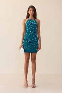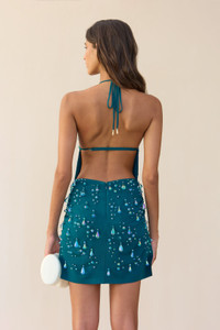 An adorned mini dress with droplet shaped beads, a high neck and an open upper back. — Mini length — Ruching throughout — Halter neck ties — Lower center back zip SIZE & FIT NOTES Model is 5'10" and is wearing a size Small COMPOSITION AND CARE 100% VISCOSE