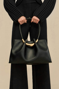 A smooth leather satchel with corded straps looped through abstract gold-toned hardware, shaped into a soft, wide silhouette with structured interior organization. — Abstract hardware handle — Antique brass tone — Wide satchel silhouette — Zipper interior compartment SIZE & FIT NOTES 6.50" W x 9.45" H x 17.32" L COMPOSITION AND CARE 100% COW LEATHER; LINING: 100% COTTON; HW: 100% ZINC ALLOY Our leather pieces are crafted from high-quality hides selected for their natural finish and handfeel. Subtle variations are inherent to the material. Wipe the surface with a soft, dry cloth to remove dust. For deeper cleaning, use a lightly dampened cloth only—never solvents, alcohols, or chemical cleaners. Keep away from heat and direct sunlight. Store the bag in its dust bag and maintain its shape by lightly filling with tissue. Keep in a cool, dry place away from humidity.