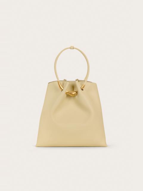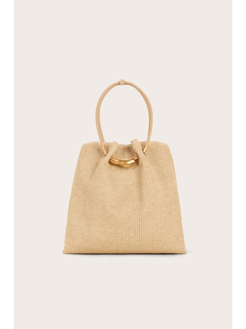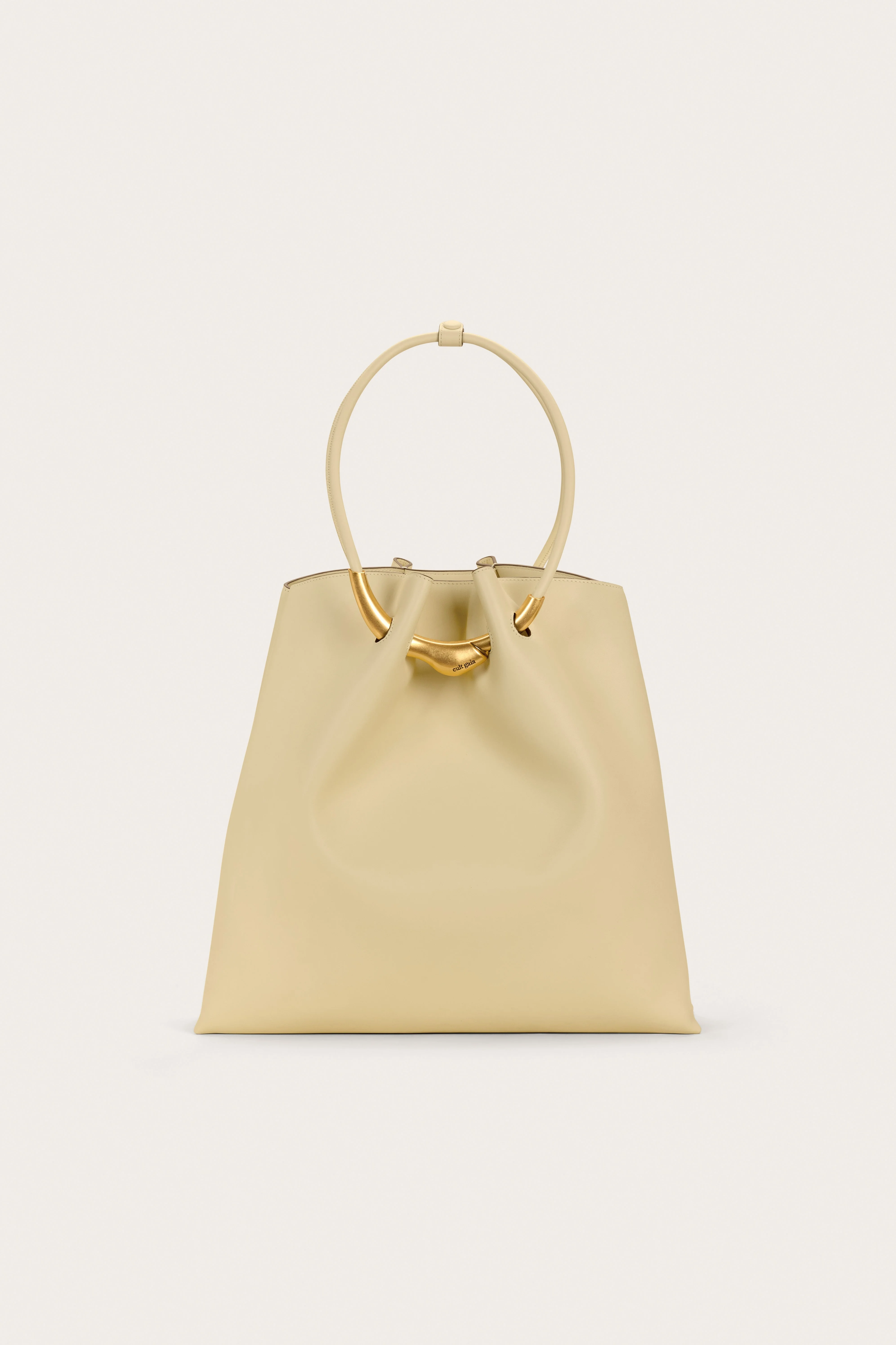 A smooth leather tote with corded straps threaded through the sides of the bag with gold toned hardware. — Abstract hardware handle — Antique brass tone — Tote silhouette — Three interior compartments SIZE & FIT NOTES 1.38" W x 14.96" H x 16.14" L COMPOSITION AND CARE 100% POLYETHYLENE; LINING: 100% COTTON; HW: ZINC ALLOY