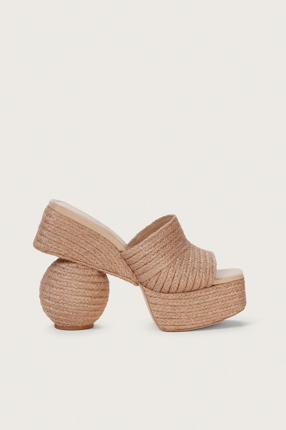 Balancing on a spherical heel, this avant-garde espadrille style platform is where design and function meet. The thick front strap holds you snuggly in and the rubber sole keeps you grounded making these platform sandals extremely walkable. FIT NOTES Heavyweight Espadrille platform Padding at sole Comfortable fit COMPOSTION AND CARE Heel height: 4" Body: 100% Jute Sole: 100% Rubber Heel: 100% Jute Wrapped Wood