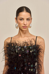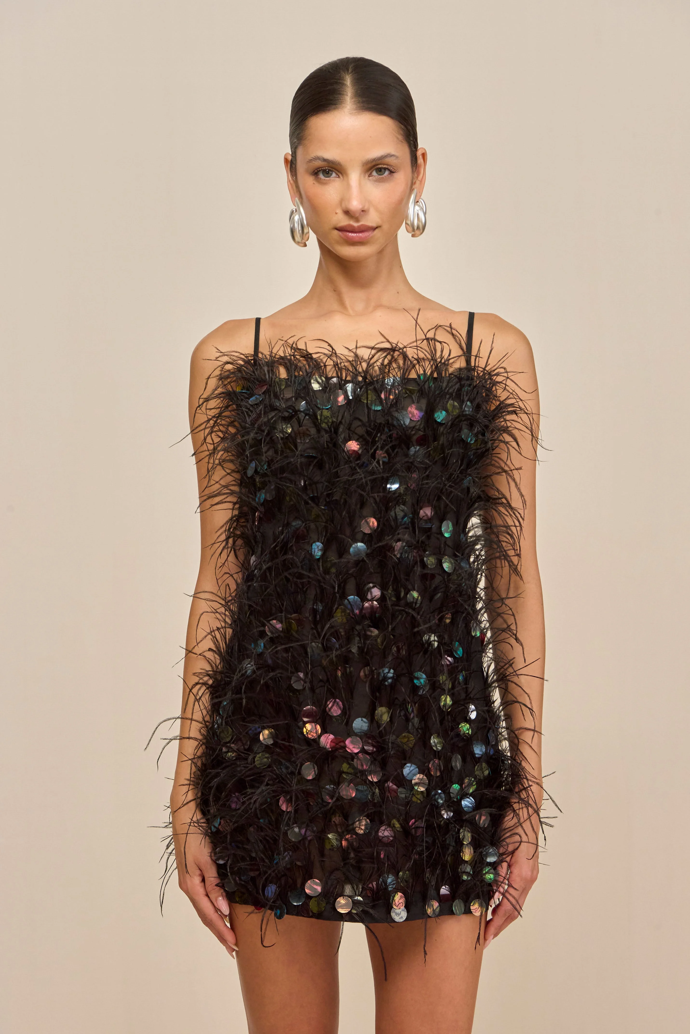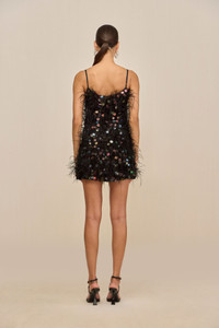 An artful mini address adorned with wispy ostrich feathers and iridescent faux mother of pearl sequins. — Mini length — Ostrich feathers — Zipper closure at back — Faux mother of pearl sequins SIZE & FIT NOTES Model is 5'10" and wearing a size Small COMPOSITION AND CARE 100% SILK