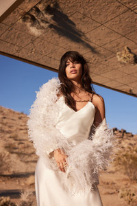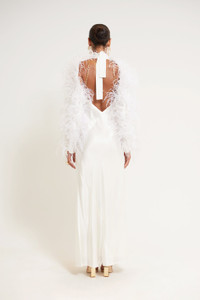 A statement-making feather adorned wonder. The Audrey is a unique long sleeve piece functioning as sleeves for gowns and dresses alike. Real ostrich feathers give flamboyant flare while ribboned ties at the neck add a touch of classic elegance. The open front and back allow it to be easily accessorized – pair with the Milla Dress or Perla Gown for a true Gaia look. Add the Mina Earring to complete the look. FIT NOTES Model is 5'7" and is wearing a size Small Ties at neck Can be worn front or back Fully lined Loose-fitting sleeve with low armhole COMPOSTION AND CARE Body: 100% Viscose Trim: 100% Ostrich Feather