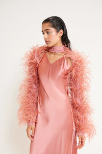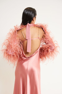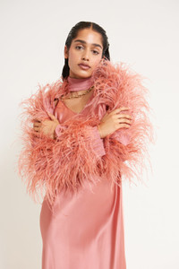 A statement-making feather adorned wonder. The Audrey is a unique long sleeve piece functioning as sleeves for gowns and dresses alike. Real ostrich feathers give flamboyant flare while ribboned ties at the neck add a touch of classic elegance. The open front and back allow it to be easily accessorized – pair with the Milla Dress or Perla Gown for a true Gaia look. Add the Ezlynn Earring for some extra sparkle. FIT NOTES Model is 5'9" and is wearing a size Small Ties at neck Can be worn front or back Fully lined Loose-fitting sleeve with low armhole COMPOSTION AND CARE Body: 100% Viscose Trim: 100% Ostrich Feather