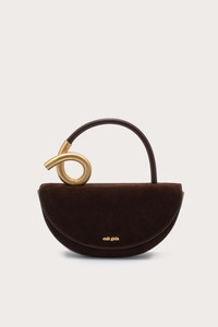 The top-handle silhouette is designed in a half moon shape and detailed with sculptural brass hardware that coils at the handle. — Smooth leather with glossy finish — Gold-toned, brushed brass hardware — Exterior slip pocket — Interior zip pocket with three card slots SIZE & FIT NOTES 9.84" H x 10.51" L x 2" W COMPOSITION AND CARE 100% CALF SUEDE; TRIM: 100% COW LEATHER; LINING: 51% RECYCLE POLYESTER, 49% POLYESTER; HW: 100% ZINC ALLOY
