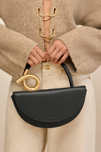 The top-handle silhouette is designed in a half moon shape and detailed with sculptural brass hardware that coils at the handle. — Smooth black leather — Gold-toned, brushed brass hardware — Exterior slip pocket — Interior zip pocket with three card slots — Can fit an iPhone