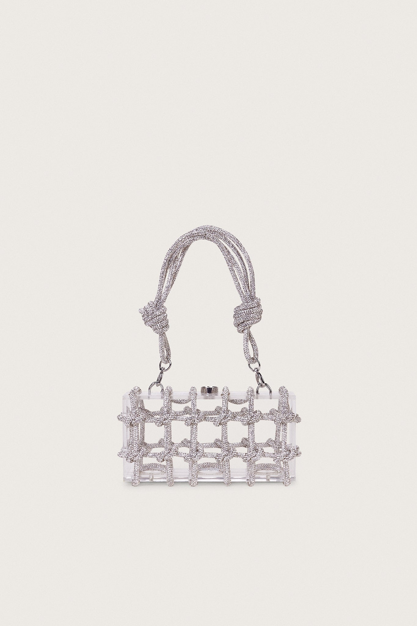 Bess is a gorgeously transparent Objet d’Art. The acrylic body is wrapped in rhinestone rope cording. The rhinestone rope-detail double strap echoes the wrapping of the body and is designed to sit elegantly on the shoulder. She’s bound to become a wardrobe staple. Small in size and unlined, she can transport and hold all of your necessary essentials with ease. SIZE & FIT NOTES Can be worn as a shoulder bag or a clutch Removable handle strap with lobster clasps Can fit an iPhone, small wallet, keys, etc. Clasp closure at top COMPOSITION AND CARE 2.3" x 4" x 7.6" Handle drop: 7.4" Body: 100% Acrylic Trim: 100% Plastic