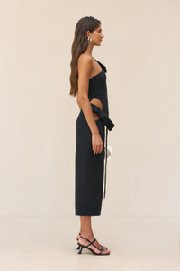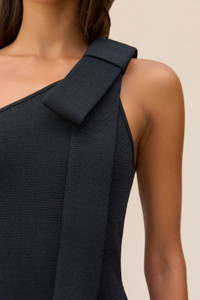 An artful knit midi dress with exaggerated bow details at the left shoulder and right hip. — Midi length — Compact knit fabric — Asymmetrical one-shoulder — Right hip cutout SIZE & FIT NOTES Model is 5'10" and is wearing a size Small COMPOSITION AND CARE 100% POLYESTER