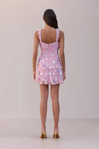 A hand beaded mini dress with a square neckline center back zipper. — Mini length — Acrylic flowers — Crepe body — All over embellished