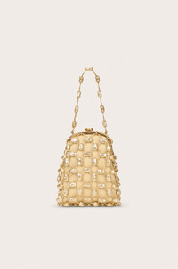 A caged pearl and lambskin evening bag with top closure. — Gold toned rings with pearl accents — Lambskin body — Top closure SIZE & FIT NOTES 1" W x 5.5" L x 7.7" H x 6.3" HANDLE DROP COMPOSITION AND CARE BODY: 100% LAMB LEATHER TRIM: 100% PLASTIC LINING: 100% POLYESTER