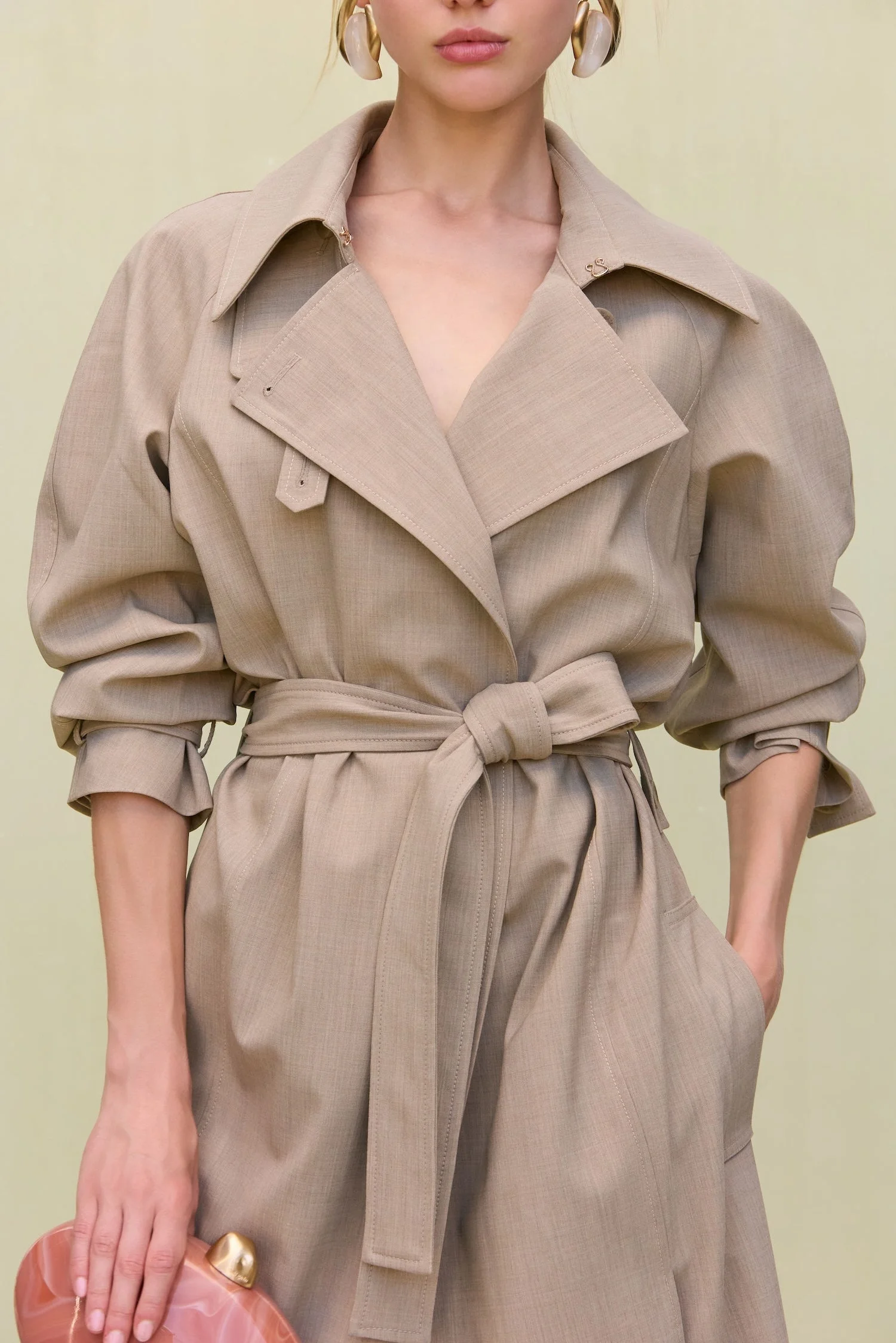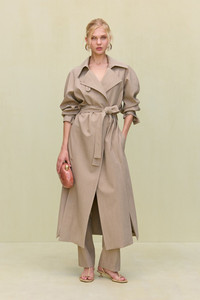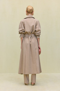 A lightweight wool trench coat with blouson sleeves and an adjustable waist tie. — Ankle length — Fine melange stretch wool — Button closure — Adjustable waist tie COMPOSITION AND CARE 96% WOOL 4% ELASTANE