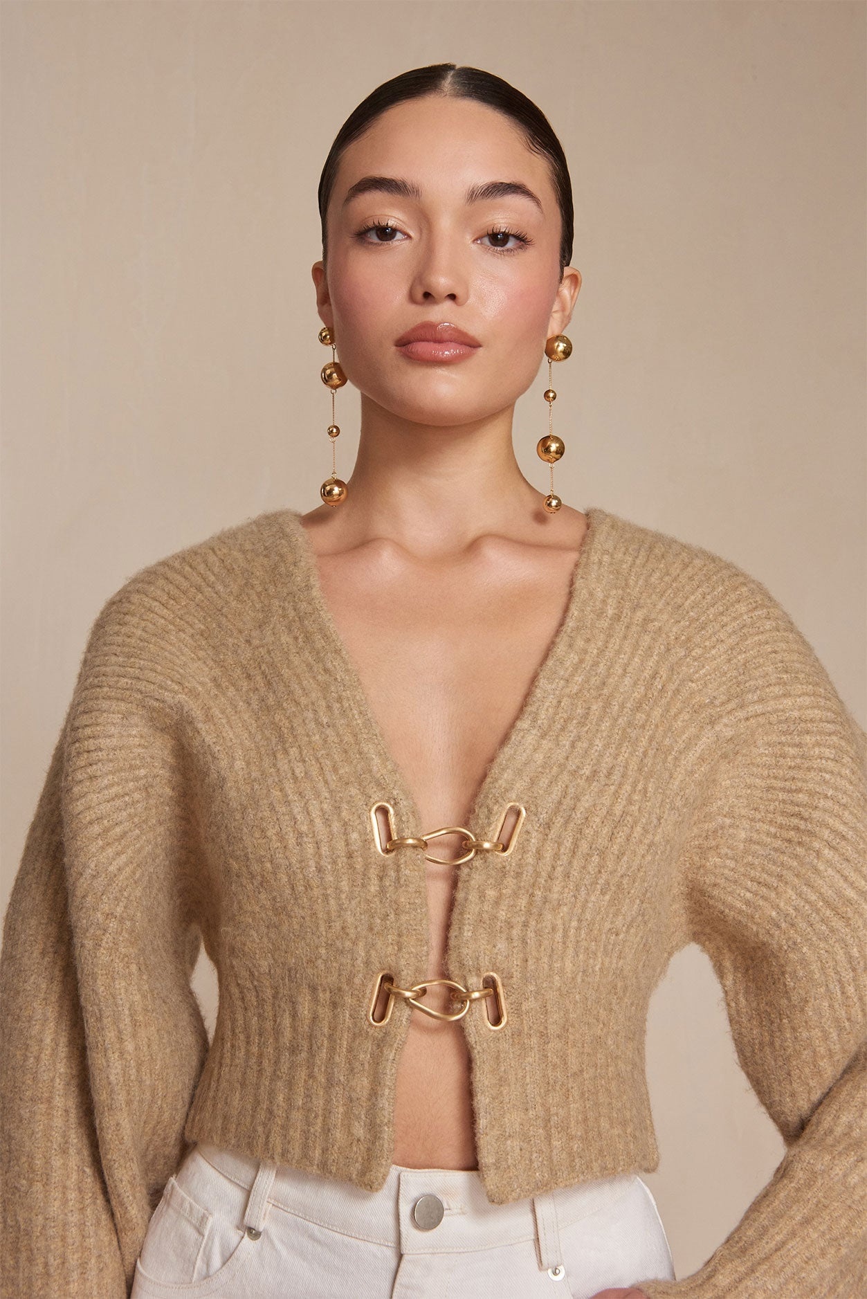 A favorite is back, now in Champagne. Designed in a lush melange wool, this creamy neutral-hued cropped and open cardigan is as comfortable as it is cool. Two signature brushed brass hardware chains at the bust allow for a relaxed fit and alluring openness. The slightly puffed sleeves that slim at the wrist give a striking silhouette. SIZE & FIT NOTES p.p1 {margin: 0.0px 0.0px 0.0px 0.0px; font: 13.0px 'Helvetica Neue'} Model is 5'9" and is wearing a size Small Fully functional center-front hardware Oversized fit; for a slimmer fit we recommend sizing down Slightly cropped Fitted waist COMPOSITION AND CARE 6% Wool 68% Acrylic 12% Polyester 11% Nylon 3% Spandex
