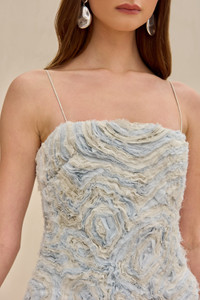 A textured swirl embroidered mini dress with thin straps and a size zipper. — Mini length — Swirl fabric embroidery — Spaghetti straps — Side zipper SIZE & FIT NOTES Model is 5'11" and is wearing a size 4 COMPOSITION AND CARE 100% VISCOSE