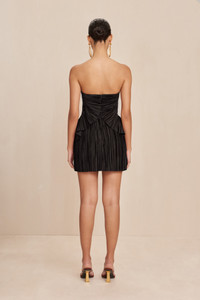 A pleated satin, strapless mini-dress with layered hip detail. — Inserted corset — Center back zipper — Fitted side paneling for a flattering silhouette SIZE & FIT NOTES Model is 5'9" and is wearing a size 4 Inner corset is fitted, we recommend sizing up for a more comfortable fit Built in corset Central back zipper Soft peplum A-line shape COMPOSITION AND CARE 100% Polyester