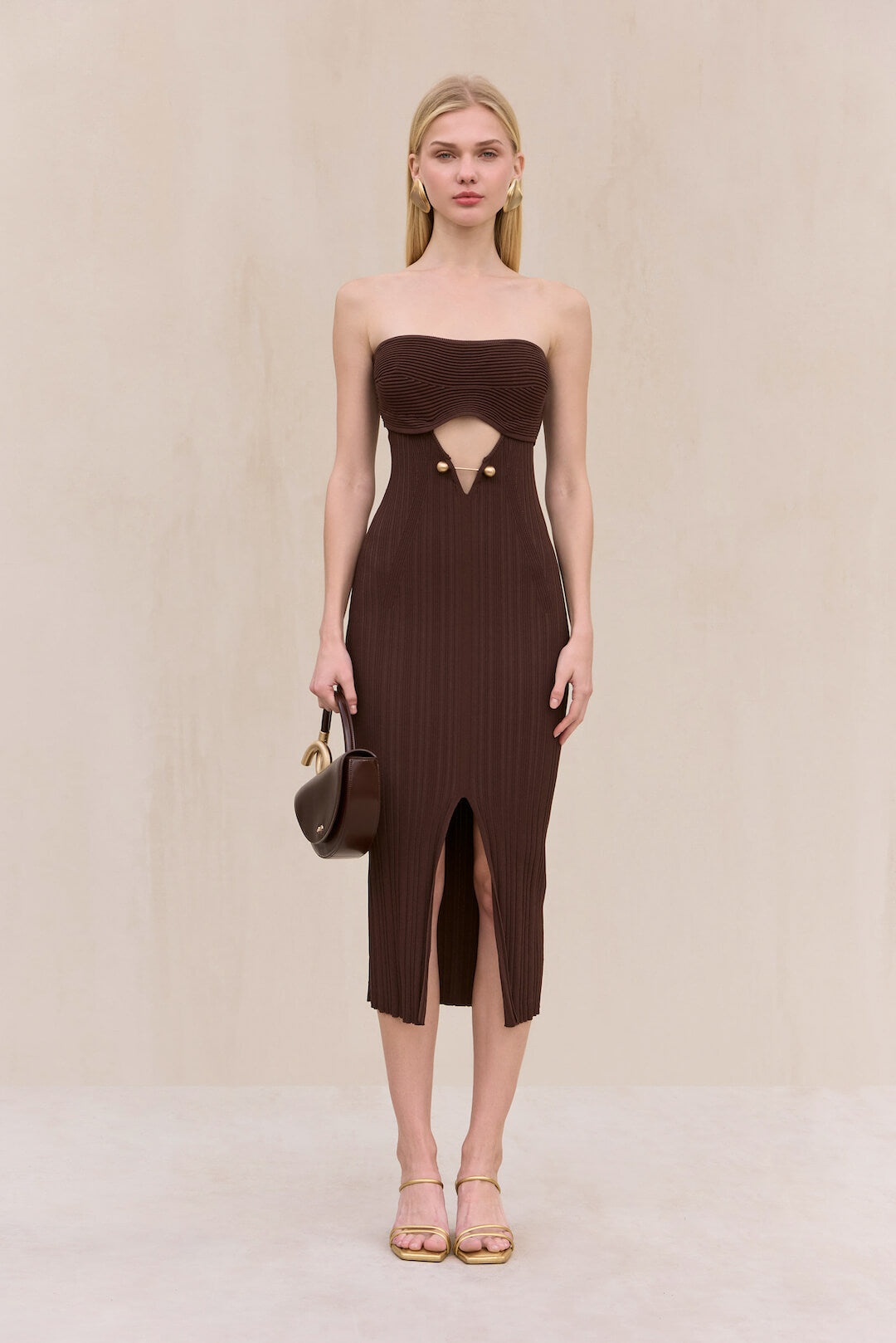 A strapless, midi-length knit dress with a center bust cutout connected by gold-toned hardware bridges and a center front slit. — Strapless — Ribbed knit design — Center front slit — Pull on style SIZE & FIT NOTES Model is 5'10" and is wearing a size Small COMPOSITION AND CARE 65% Viscose 35% Nylon