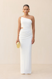 A gathered, open-back column dress with textured chain hardware. — Lined — Stretch fabric — Textured, gold-toned brass hardware at shoulder — Floor length — Cutout at waist SIZE & FIT NOTES Model is 5'10" and is wearing a size Small Runs small — We recommend sizing up COMPOSITION AND CARE 100% Viscose