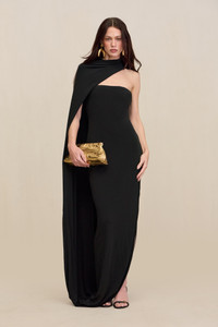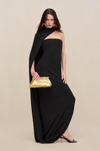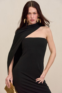 An elegantly draped gown with a strapless bodice and a full length skirt that doubles as a cape-like shawl. — Strapless — Viscose material — Maxi length — Skirt becomes a shawl SIZE & FIT NOTES Model is 5'10" and wearing a size 4 COMPOSITION AND CARE 100% VISCOSE