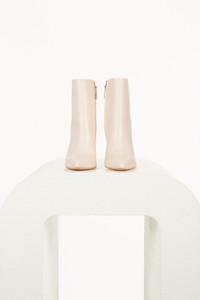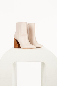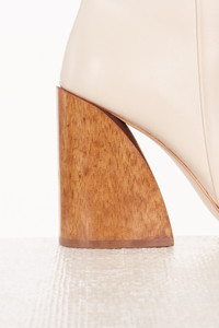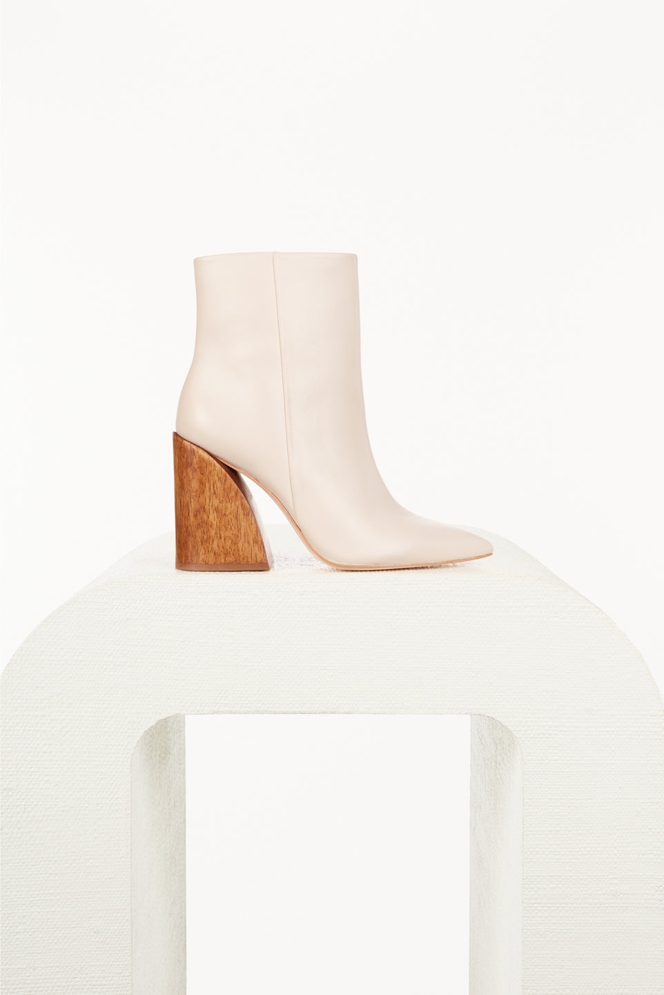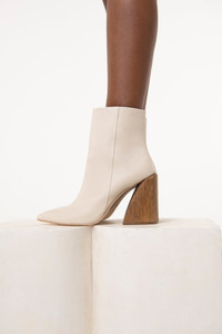 The Cristie Boot has a sculptural wooden heel that creates a slimming effect. The geometric angularity of the heel is beautifully reflected in the pointed toe. Smooth, neutral-hued leather gives a sophisticated air that goes with everything. FIT NOTES Hand-carved wooden heel Lightweight Soft leather Side zipper COMPOSTION AND CARE Heel height: 5.5" Body: 100% Cow Leather Sole: 100% Rubber Heel: 100% Wood