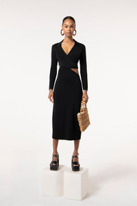 A sophisticated knit wrap-dress in shiny viscose yarn. The Cristina Dress has graceful, asymmetrical cutouts at the waist that lead to a mid-calf length skirt. The collar, long sleeves and decorative ties at the waist give it an elevated, nearly shirt-dress feel. FIT NOTES Model is 5'9" and is wearing a size Small Faux wrap dress Stretchy Asymmetrical waist Adjustable tie strap at waist If petite, we recommend sizing down COMPOSTION AND CARE 100% Viscose