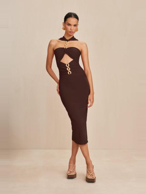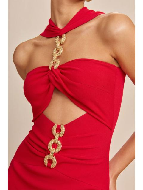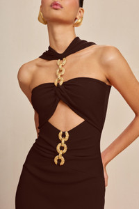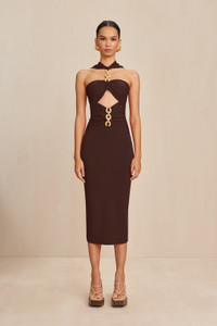 A midi-length knit dress with gold-toned chain-link hardware, high neck, and central cutout. — Texture, gold-tone brass chain — Gathered at center front — Straight fit skirt — Runs small, if between sizes we recommend sizing up SIZE & FIT NOTES Model is 5'9" and is wearing a size Small Runs small — if between sizes, we recommend sizing up COMPOSITION AND CARE 65% Viscose 35% Nylon