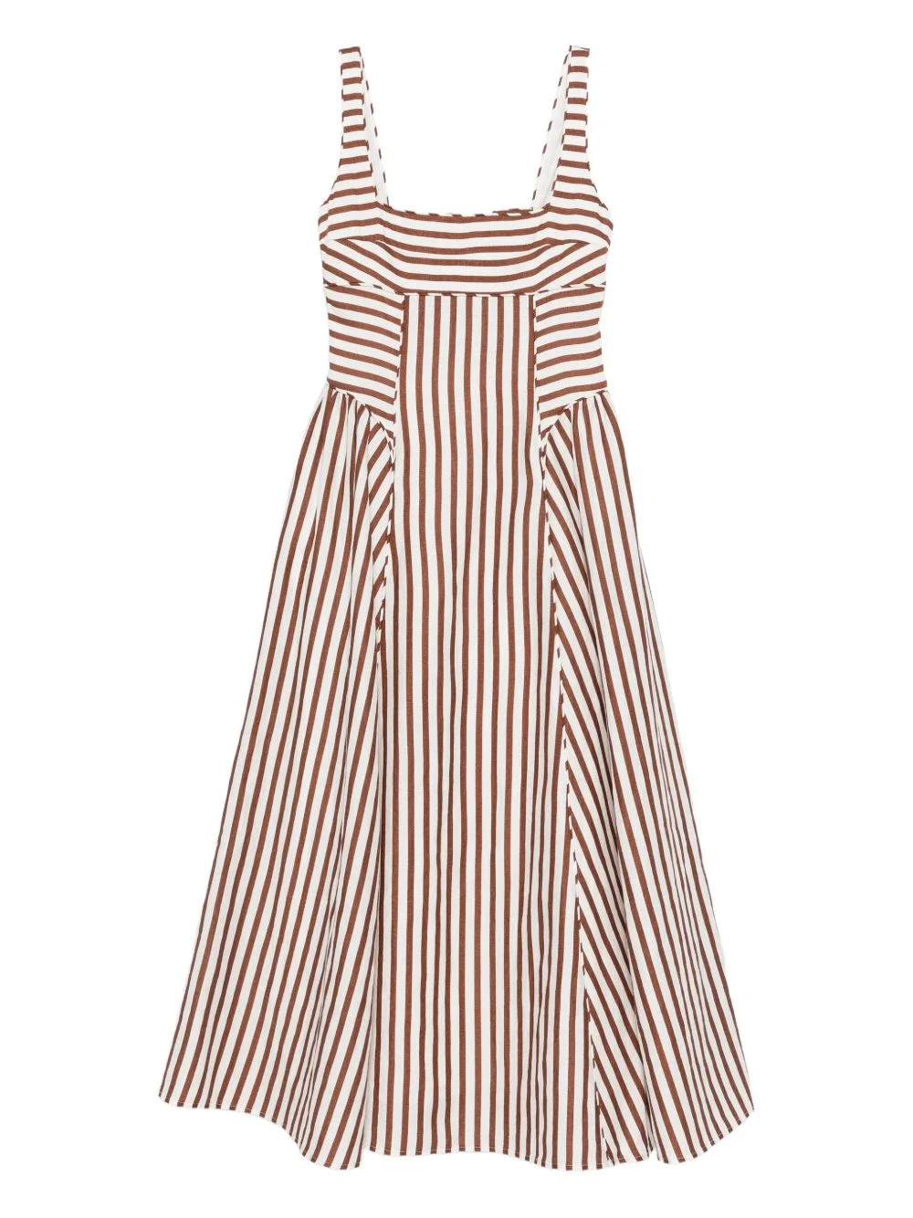 Carla striped midi dress Highlights - Brown and white - Striped pattern - Square neck - Wide straps - A-line skirt Imported Composition Outer: Linen/Flax 38%, Wool 25%, Rayon 20%, Silk 17% Lining: Cotton 100% SIZE & FIT Model measurements Height 5 ft 8 in(1.73 m) Bust/Chest 29.92 in(76 cm) Hips 33.07 in(84 cm) Waist 23.22 in(59 cm) Washing instructions Dry Clean Only