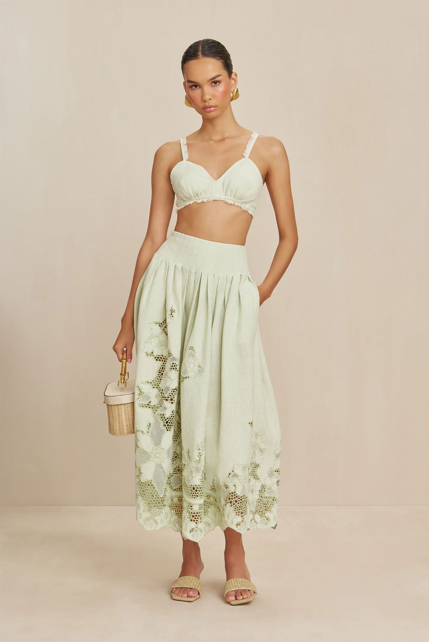Preorder - Estimated Ship Date Between April 11th to April 25th A pleated high-waisted linen skirt with a scalloped hem and embroidered floral motifs. — Pockets — High waist — Scalloped hem with embroidered floral motifs — Linen FIT NOTES Model is 5'9" and is wearing a size 4 COMPOSTION AND CARE 100% LINEN