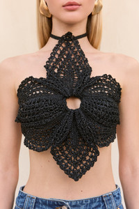 An objet d'art, this is a floral crochet top featuring a halter neckline with adjustable ties and a bare all open back. — Crochet — Adjustable tie halter neckline — Body hugging with a bit of stretch — Two straps at the back COMPOSITION AND CARE 100% Polyester Dry clean only