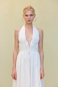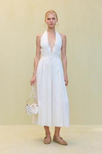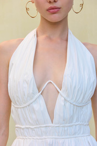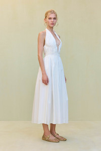 Preorder - Estimated Ship Date is Between February 22nd and March 8th A day dress inspired by our best selling Aashvi Gown, featuring a halter neckline and wire details at the bust. — Midi length — Nylon poplin — Halter neckline — Wire details at bust