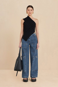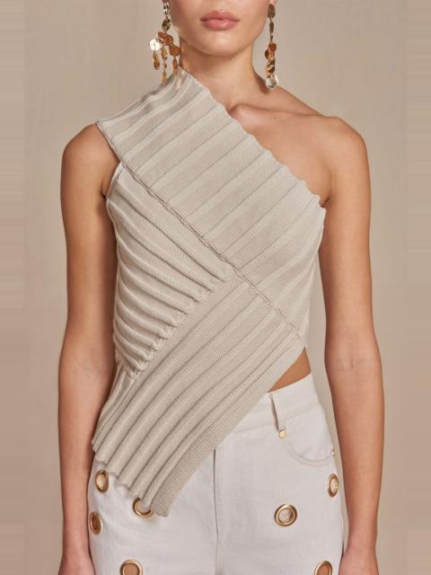 The modern, colliding angles of the Del Top are designed to create an ultra-flattering silhouette. A contrasting band extends from the waist up and over the right shoulder, while the left shoulder is exposed. Thoughtful cutouts and angular ribbed knit patterns add a hint of flair to this transitional knit wardrobe staple. COMPOSITION AND CARE 100% Cotton