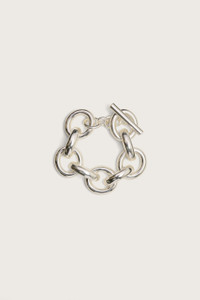 The Delphi is a chunky chain bracelet that is sure to light up your wrist with some refined shine. She is rendered in antique silver-toned, brushed brass. Every other circular link has a flat edge to allow for easy wear. Her toggle clasp allows for adjustable fit. An embossed Cult Gaia logo is discreetly positioned on the flat edge of the link closest to the toggle clasp. Add some shine and texture to your next look. SIZE & FIT NOTES Toggle Closure COMPOSITION AND CARE 100% Brass