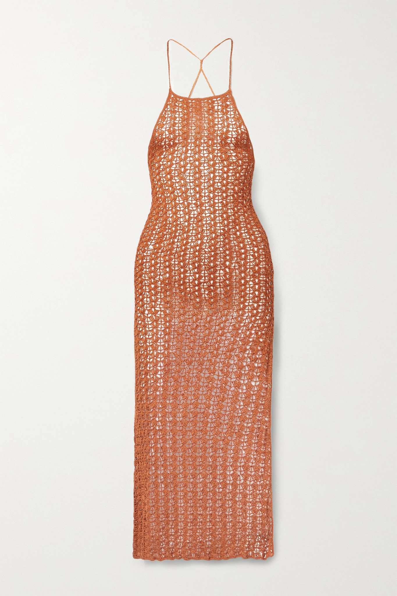- Burnt-orange crochet-knit - Ties at back - 92% viscose, 8% nylon - Dry clean - Designer color: Spice - Imported