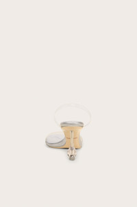 A high-heeled sandal with a pedestal stiletto heel and clear vinyl straps. — Metallic leather footbed — Pedestal stiletto heel — Clear vinyl toe and ankle straps — 3.54" heel height SIZE & FIT NOTES 90mm heel height COMPOSITION AND CARE UPPER: 100% TPU INSOLE: 100% COW LEATHER OUTSOLE: 100% RUBBER INTERIOR HEEL: 100% PLATED METAL EXTERIOR HEEL: 100% ACRYLIC