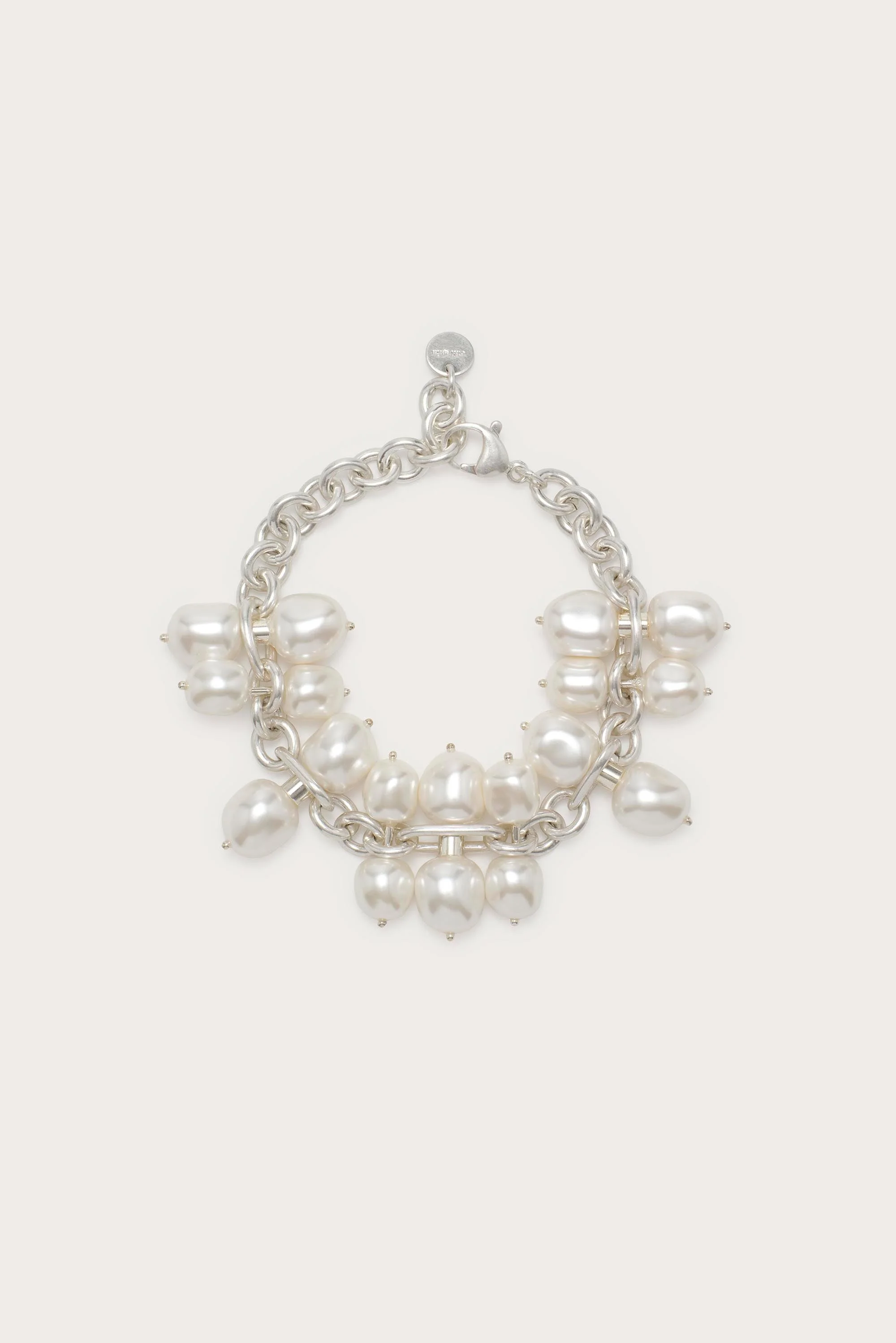 A chain link bracelet adorned with faux pearls. — Faux pearls — Chain link design — Brass — Clasp closure SIZE & FIT NOTES 1.25" H x 8.50" L COMPOSITION AND CARE 100% BRASS, TRIM: PLASTIC PEARLS