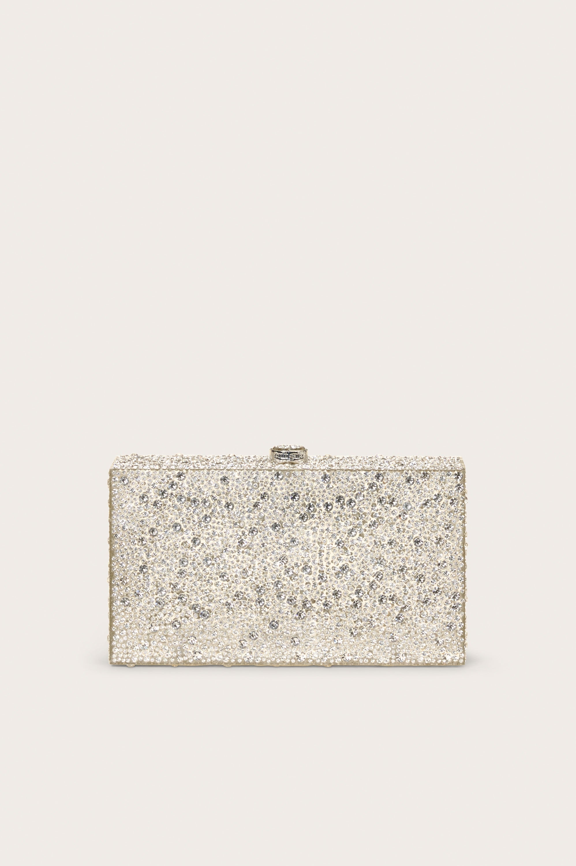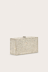 A rectangular, transparent acrylic clutch with rhinestone accents complete with a top closure. — Transparent acrylic body — Rhinestone accents — Top closure SIZE & FIT NOTES 2.36" W x 3.74" H x 7" L COMPOSITION AND CARE 100% ACRYLIC, TRIM: 100% GLASS