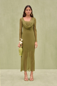 A crinkle silk midi dress with an adjustable cowl neck and asymmetrical bottom seam detail. — Midi length with mini slip — Crinkle silk — Adjustable cowl neck — Side hook and eye closure — Asymmetrical bottom seam detail FIT NOTES Most of our orders are shipped 24-48 hours from purchase pending availability and credit verification. Once your order is shipped, we estimate you will receive your order within 5-7 business days of its ship date. If you need your item(s) sooner, please select the expedited shipping option. Shipping times may vary, but rest assured we work our hardest to get you your order as quickly as possible. Please note all items noted as final sale are not eligible for exchange or return. We currently do not accept exchanges or returns for international customers at this time. If you have any questions, please be sure to reach out to hello@cultgaia.com . COMPOSTION AND CARE Click here for live chat Email: hello@cultgaia.com Note: Available Monday-Friday 9 to 5 PST. Excluding Holidays and Weekends.