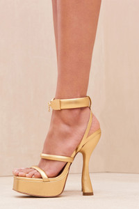 A work of art. Designed in a shimmering metallic gold nappa leather, Elodie will give you lift and style. Her strapping and platform sole is complimented by moire textured gold-toned metal closure details on the adjustable ankle strap, while her heel has a sculptural shape that draws attention. FIT NOTES Middle strap for extra security Custom hardware closure True to size COMPOSTION AND CARE Heel: 5.5" UPPER: 100% Cow Leather SOLE: 100% Reconstituted Leather HEEL: 100% ABS