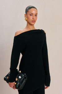 Preorder — Estimated ship date between December 13th and December 27th A wool-blend knit top with an extra-wide boat neck and gold-toned hardware detail at the left shoulder. — Long sleeve — Wool blend — Boat neck — Gold-toned hardware detail — Asymmetrical hem — Wear with the Sudi Knit Pant SIZE & FIT NOTES Model is 5'10" and is wearing a size Small COMPOSITION AND CARE 35% NYLON 35% VISCOSE 30% WOOL