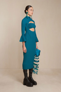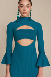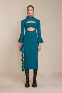 Preorder - Estimated Ship Date Between August 24th and September 7th The versatility of the reversible Elven cannot be understated. This maxi-length dress knit in stretchy yarn features a signature Cult Gaia circular cutout bifurcated by a thick band. That band that can be used either as a bra or back strap. The high neckline cascades down in ribbed knit to the bust. Thin, long sleeves flare out after the elbow to create exaggerated, bell-shaped cuffs. Pairs perfectly with a tall pair of boots. FIT NOTES p.p1 {margin: 0.0px 0.0px 0.0px 0.0px; font: 13.0px 'Helvetica Neue'} Model is 5'9" and is wearing a size Small COMPOSTION AND CARE 65% Viscose 35% Nylon