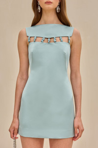 A structured satin mini dress with tonal rock hardware details. — Square neckline — Lattice cutout at chest with rock details — Rock detail at back shoulder straps — Center back zipper FIT NOTES Model is 5'11" and is wearing a size Small COMPOSTION AND CARE 100% POLYESTER