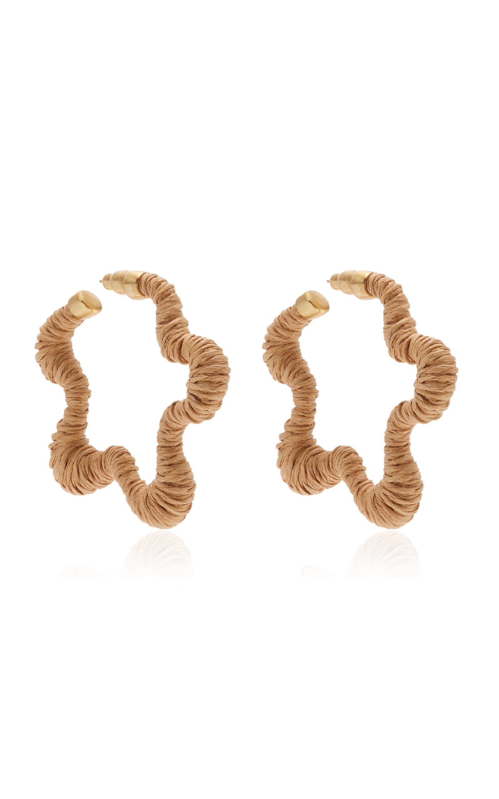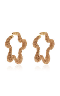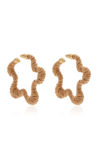 L.A.-based Jasmin Larian Hekmat, the brains behind the cult-favorite ‘Ark’ bag, returns with more ultra-desirable accessories. Made from gold-tone metal, the 'Emiko' earrings have sculptural star-shaped hoops covered in raffia. PRODUCT DETAILS - Post fastening for pierced ears - Composition: 100% brass, Trim: 100% raffia - Designer color: Toasted Natural - Imported