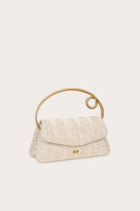 A true objet d'art that blends natural textures with sculptural elegance. Intricately woven with a rhythmic wave pattern, this structured bag features a gilded, spiral-accented top handle. Complete with a magnetic flap closure, the Emily Bag is the perfect companion for sunlit escapes and moonlit soirees alike. SIZE & FIT NOTES 120mm W x 155mm H x 270mm L COMPOSITION AND CARE 62% RAYON VISCOSE, 38% COTTON, 100% ZINC ALLOY, 100% COTTON TWILL