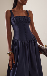 L.A.-based Jasmin Larian Hekmat has cornered the market for fashion-forward pieces inflected with the ease of California. Informed by her coastal lifestyle, she mixes playful details in flirty dresses and artful sets you’ll return to year after year. Cut from crisp poplin, the 'Emmett' dress features an on-trend corset-inspired bodice with a ruched bust and a button front. PRODUCT DETAILS - Pre-Fall '25 - Zip fastening - Composition: 100% polyester - Designer color: Deek Lake - Dry clean - Imported