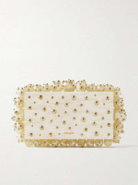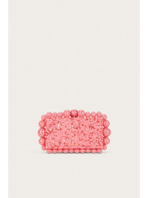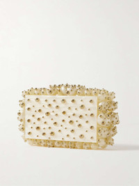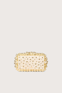 The signature pearlized acrylic box shaped clutch with coordinating acrylic beads surrounding the edges. — Studded brushed brass bead details — Signature Cult Gaia logo FIT NOTES WIDTH: 2.36" HEIGHT: 3.74" LENGTH: 7.00" COMPOSTION AND CARE 100% Acrylic Trim: 100% ABS