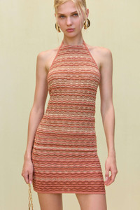 A knit halter dress with tonal stripes and large bow ties at the low back and high neck. — Mini length — Adjustable halter neck — Low back — Stretch fit COMPOSITION AND CARE 100% TENCEL