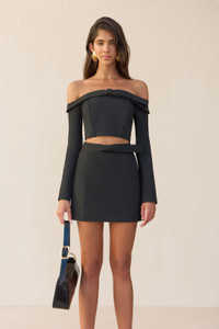 A tailored mini skirt with a bow detail at the waist and a hidden center back zip. — Mini length — A-line silhouette — Bow detail at waist — Center back zip — Wear with the Valia Top SIZE & FIT NOTES Model is 5'10" and is wearing a size 4 COMPOSITION AND CARE 61% POLYESTER 27% VISCOSE 12% ELASTANE