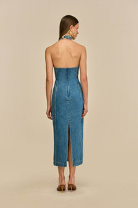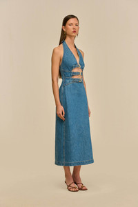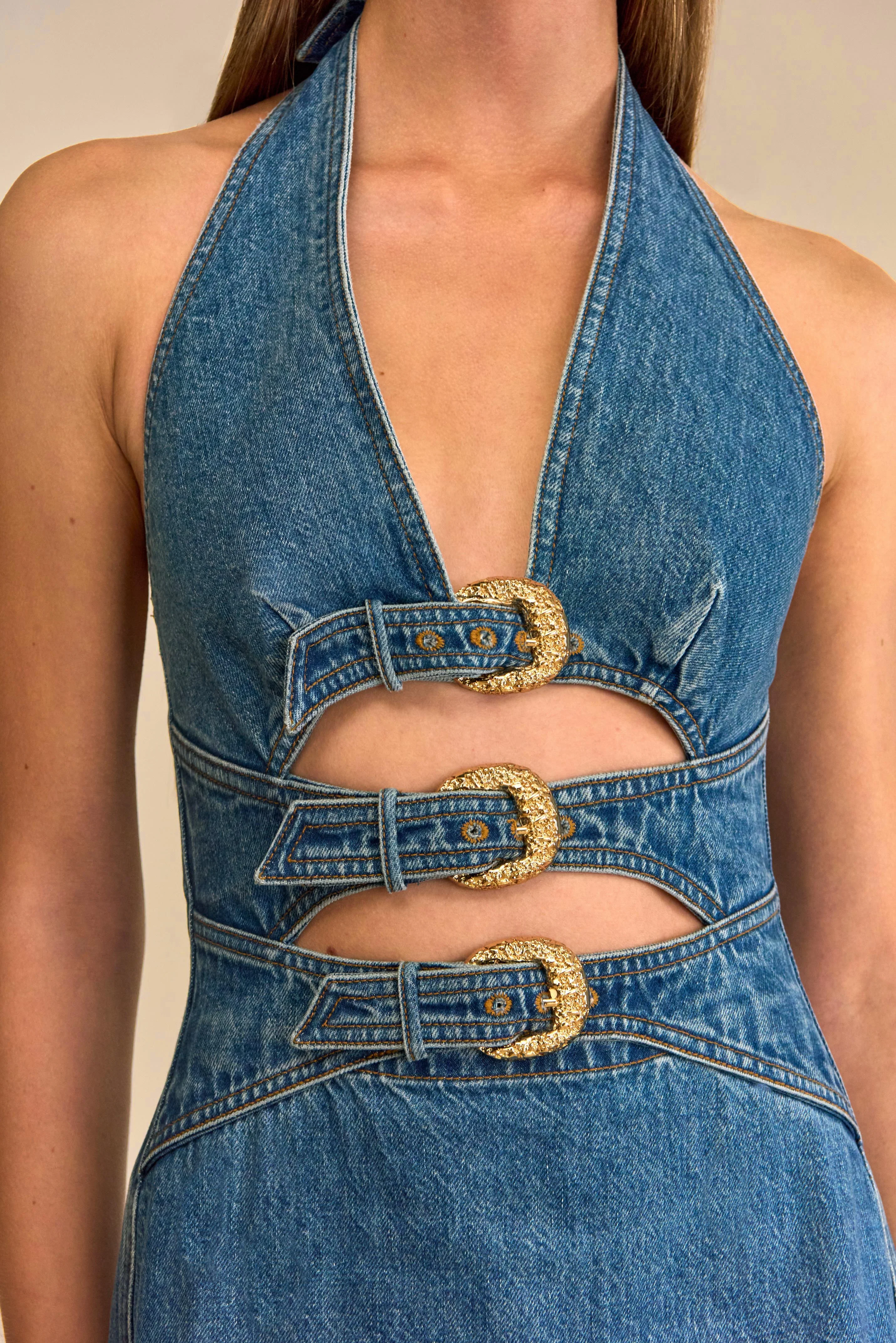 A denim halter midi-dress with adjustable, textured shiny brass buckles. — Lightweight denim — Gold-toned brass hardware — Adjustable halter strap — Back zipper closure SIZE & FIT NOTES Model is 5'10" and wearing a size 4 COMPOSITION AND CARE 100% COTTON