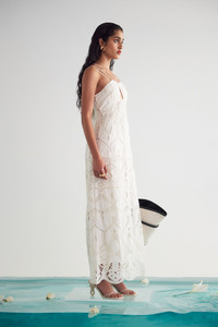 The stunning crochet details of this ankle-length cotton dress will have all eyes on you. The halter top features six straps at the front that cross over in the back with adjustable straps. An invisible zipper on the side offers easy wear. A removable slip allows for versatile use and can be taken on or off depending on how much skin you want to bear. FIT NOTES Model is 5'9" and is wearing a size Small Removable slip Full coverage bust Adjustable straps Invisible zipper COMPOSTION AND CARE 100% Cotton